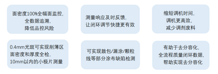 这款面密度仪的测量光斑仅为0.4*12mm,如此细小的光斑使得测量更为精细,能够捕捉到更为微小的面密度/厚度变化。同时,其重复精度高达0.03g/m²,保证了测量结果的稳定性和可靠性。